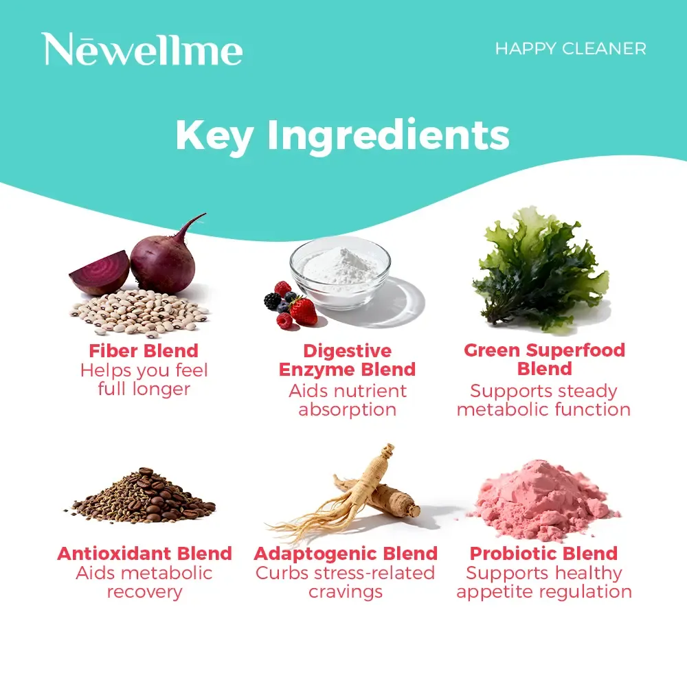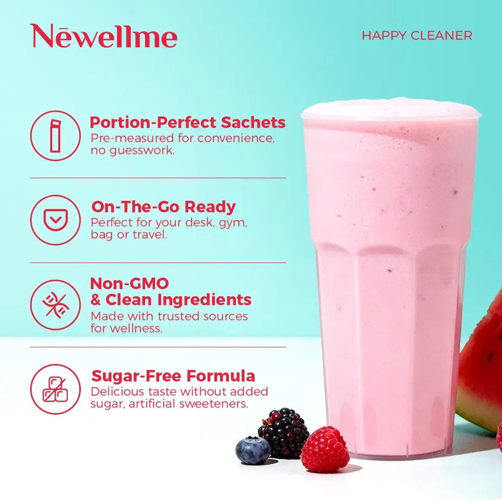 NEWELLME Happy Cleanse superfood powder is designed to support gut health and boost immunity. Packed with probiotics, digestive enzymes, and moringa, this blend keeps you feeling your best.